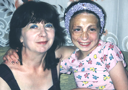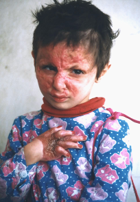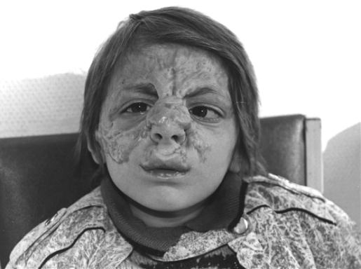 Therapie: Exzision aller hypertrophen Narben im Gesicht und Deckung der Defekte teils mit Vollhaut-, teils mit Spalthauttransplantaten Lösung aller Narben der rechten Hand zur Wiederherstellung der Funktionsfähigkeit der Finger, Deckung des Handrückens mittels freiem mikrovaskulären Lappen